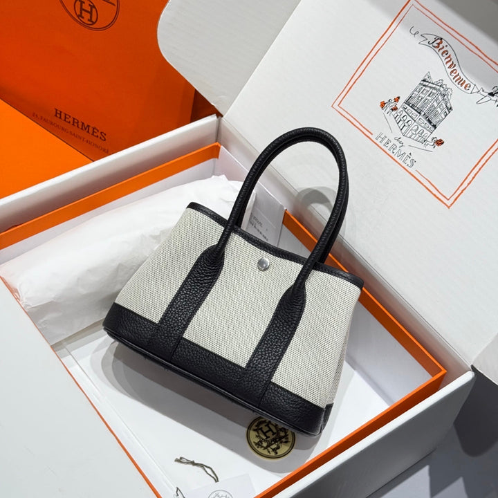 GARDEN PARTY 23CM IN WHITE TOILETS COTTON CANVAS AND BLACK CALFSKIN