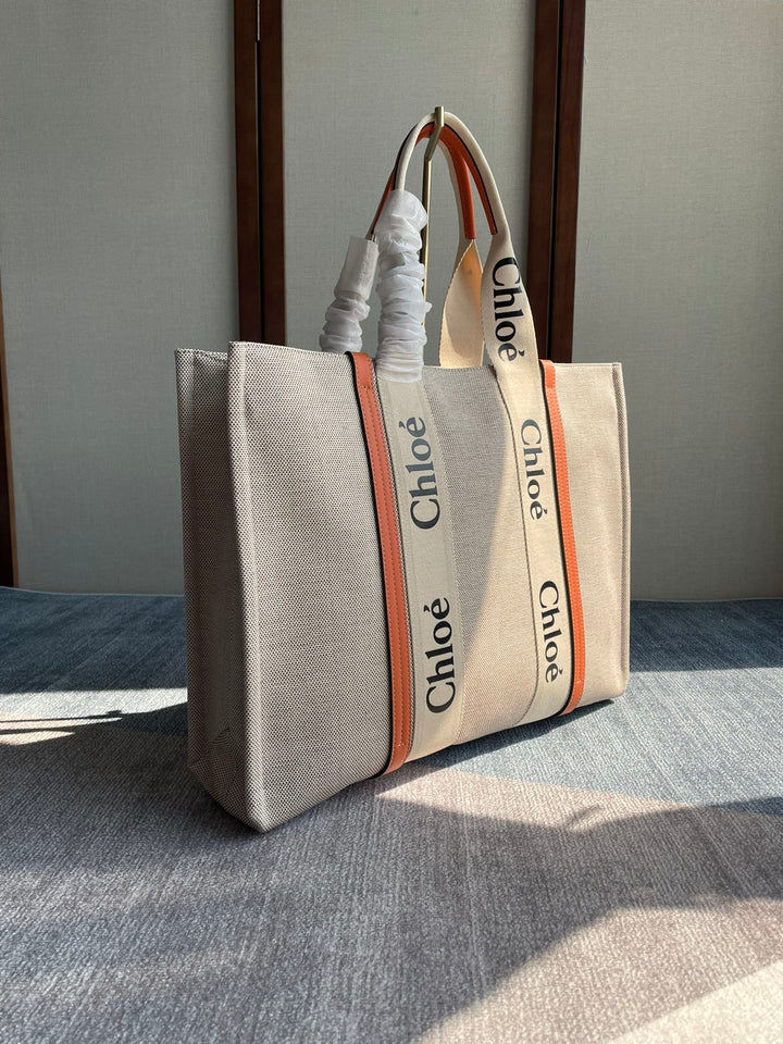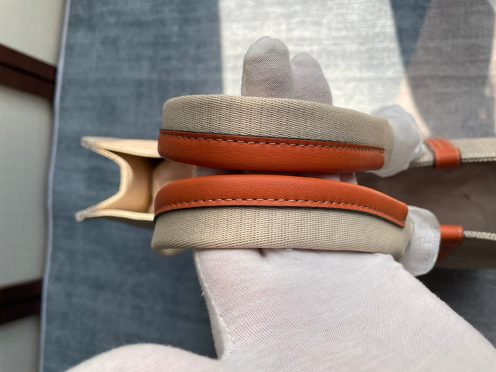 LAGRE WOODY TOTE BAG 45 IN BEIGE LINEN CANVAS BLACK WEBBING LOGO EMBROIDER ORANGE CALFSKIN