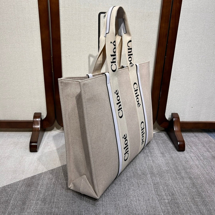 LAGRE WOODY TOTE BAG 45 IN BEIGE LINEN CANVAS BLACK WEBBING LOGO EMBROIDER WHITE CALFSKIN