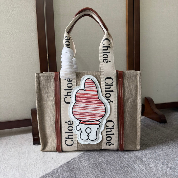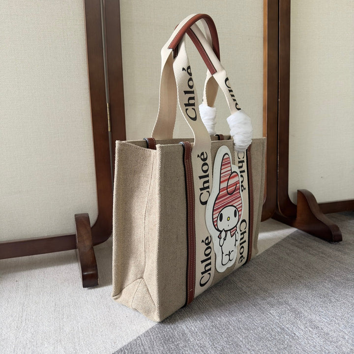 MY MELODY MEDIUM WOODY TOTE BAG 37 IN NATURAL FIBERS BEIGE WEBBING BROWN CALFSKIN