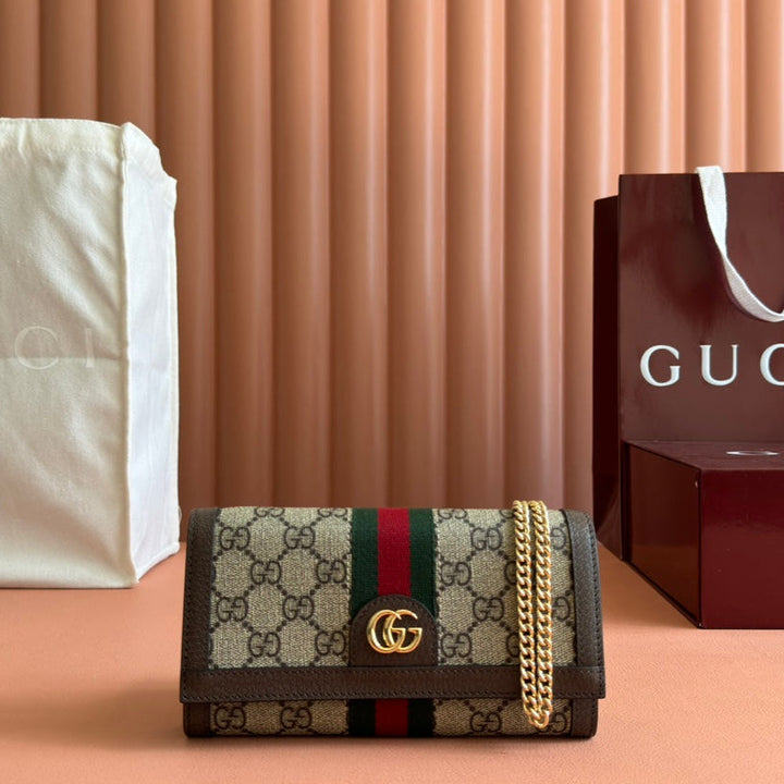 OPHIDIA WALLET ON GOLD CHAIN 19 IN BEIGE AND DARK BROWN CANVAS AND BROWN CALFSKIN