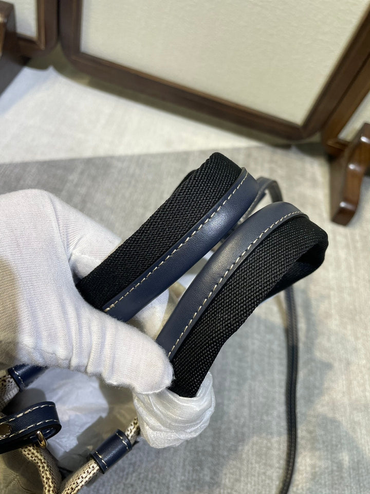 SMALL STRAP WOODY TOTE BAG 26.5 IN BEIGE LINEN CANVAS BLACK WEBBING DARK BLUE CALFSKIN