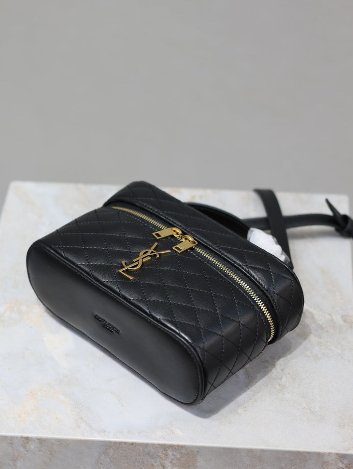 GABY MINI VANITY 18 IN BLACK QUILTED LAMBSKIN GOLD HARDWARE