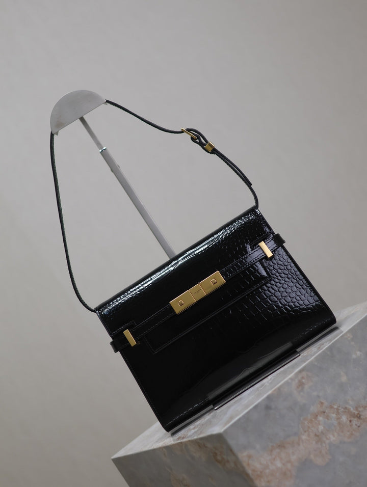 MANHATTAN SMALL 24 IN BLACK CROCODILE PATTERN GLOSSY CALFSKIN GOLD BUCKLE